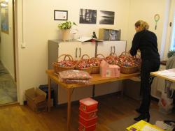 Inne på kontoret finns en riktig tomteverkstad. Både godiskorgar och julkort har knåpats ihop till jul.